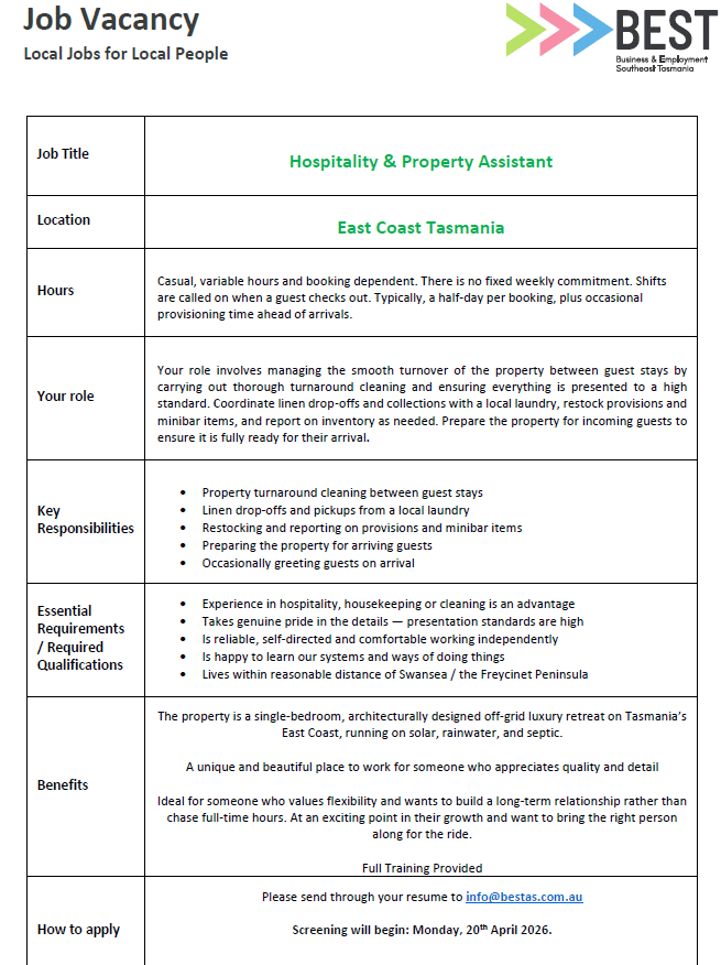 Casual Hospitality & Property Assistant – East Coast Tas